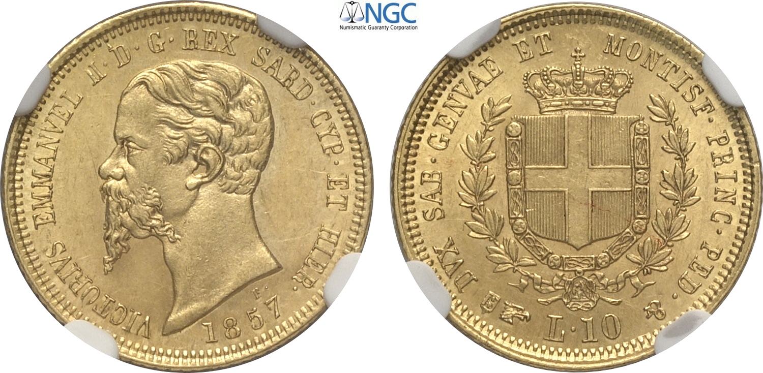 Savoia, Vittorio Emanuele II Re di Sardegna (1849-1861), 10 Lire 1857 Torino, Rara Au 18 mm, di alta qualità per la tipologia, in Slab NGC MS61