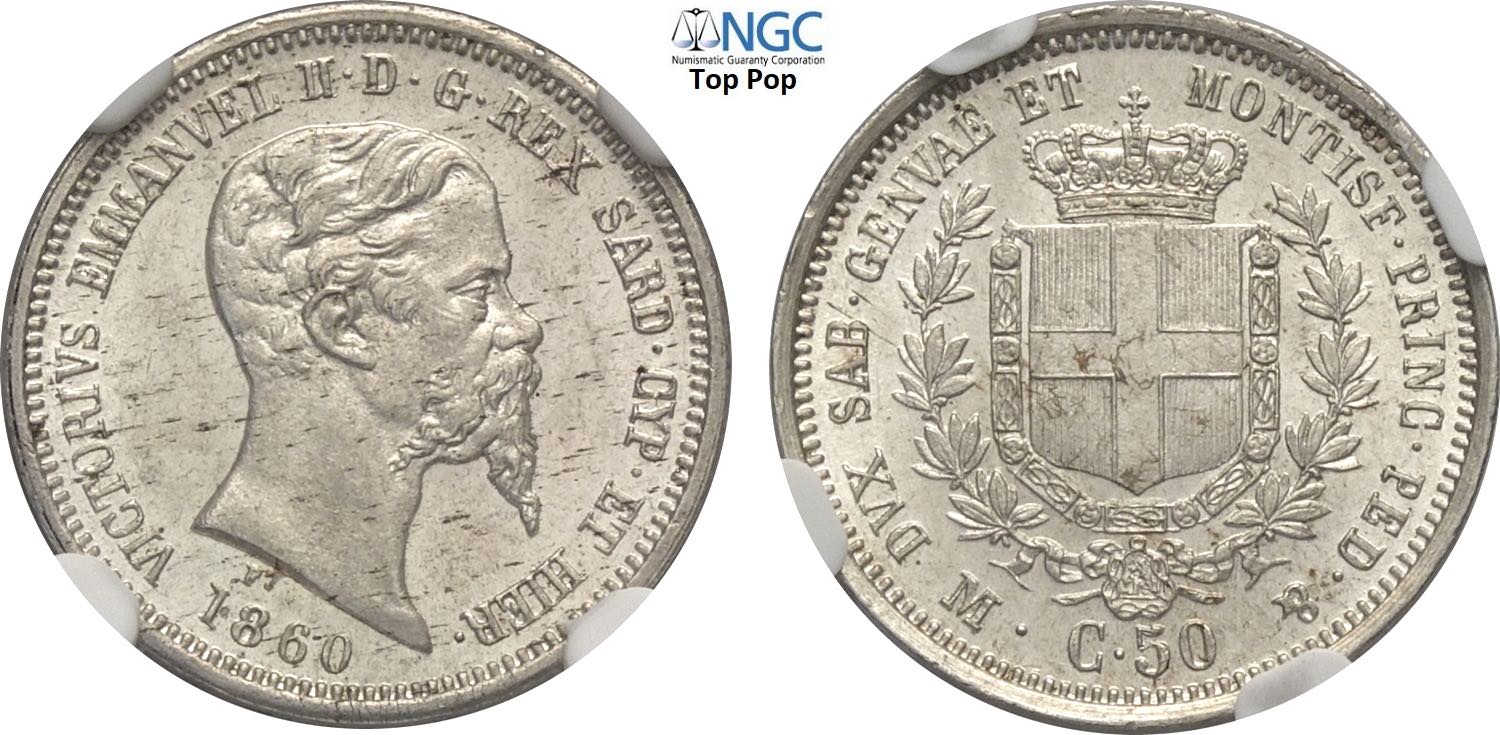 Savoia, Vittorio Emanuele II Re di Sardegna (1849-1861), 50 Centesimi 1860 Milano, Ag 18 mm 2,5 g, in Slab NGC MS64 Top Pop! (cert. 2824087013)