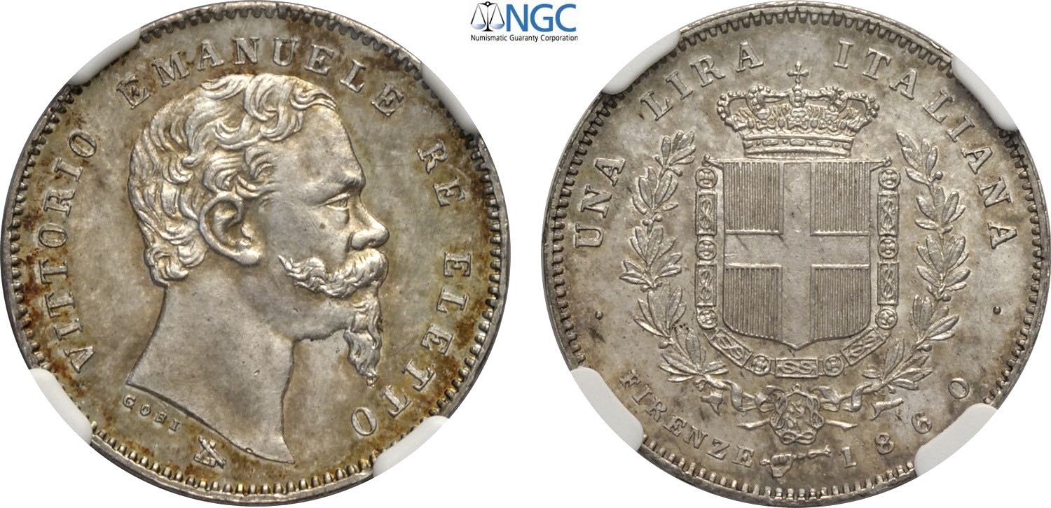 Savoia, Vittorio Emanuele II Eletto (1859-1861), Lira 1860 Firenze, Gig-13 Ag 23 mm, in Slab NGC MS64