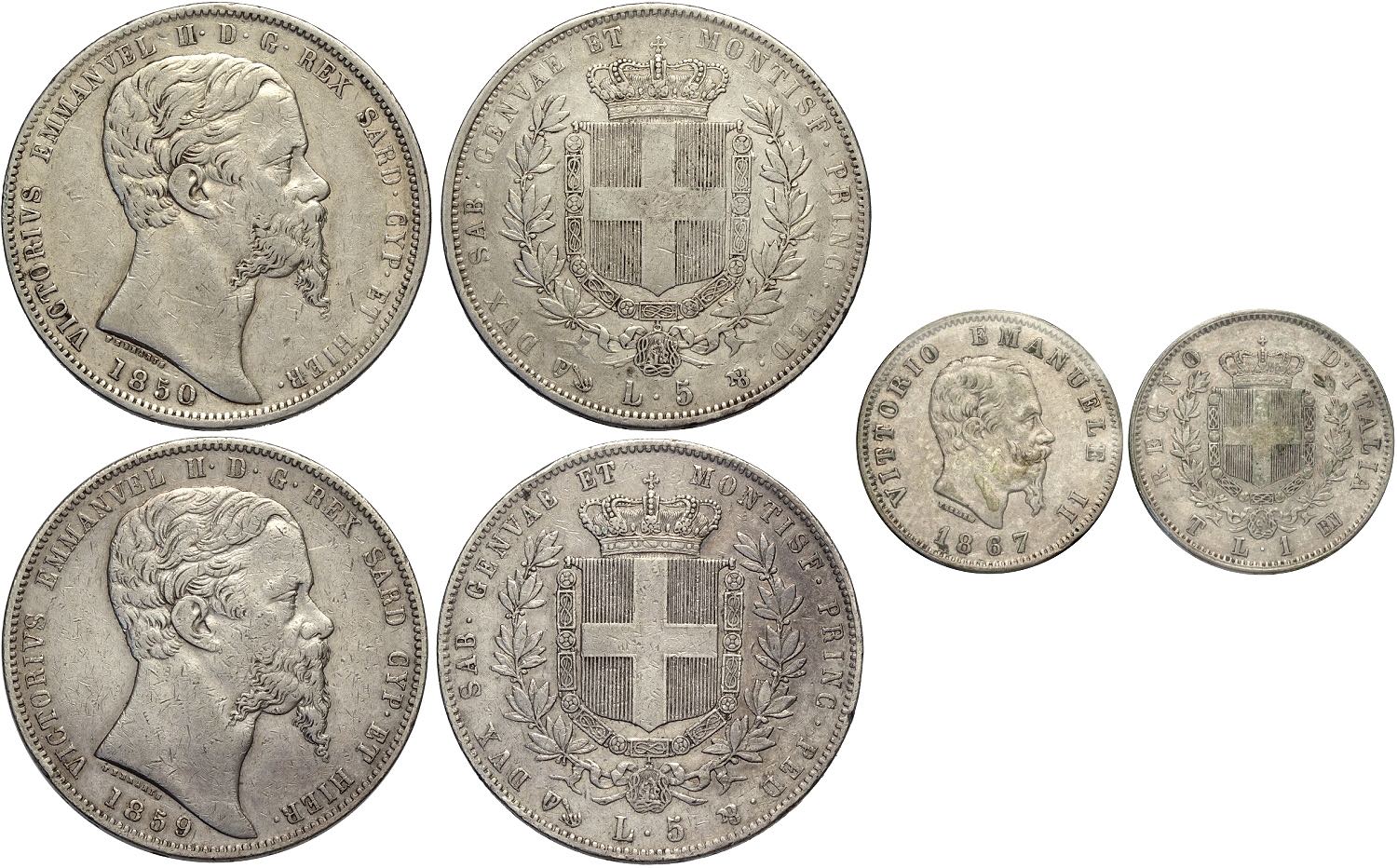 Vittorio Emanuele II (1849-1878), Lotto di 3 monete: 5 Lire 1850 Genova (Rara, BB), 5 Lire 1859 Genova (Rara, BB), Lira 1867 Torino (RR, sigillata BB da A. Bazzoni)