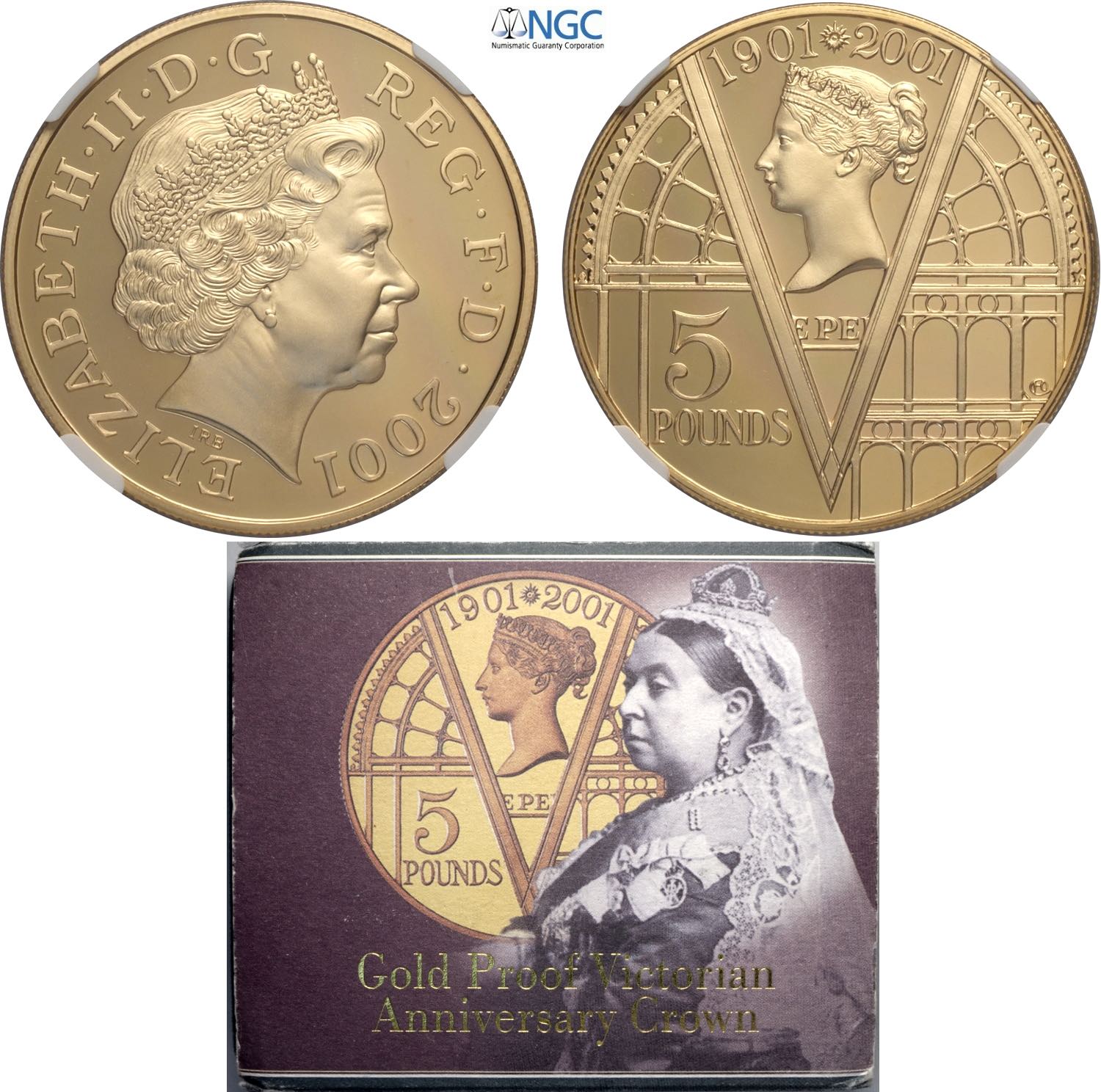 Great Britain, Elizabeth II (1952-2022), Proof 5 Pounds 2001 Victorian Anniversary Crown, London Mint, Mintage: 2098, Au 38,61 mm 39,94 g, with original box and certificate. In Slab NGC PF69 Ultra Cameo