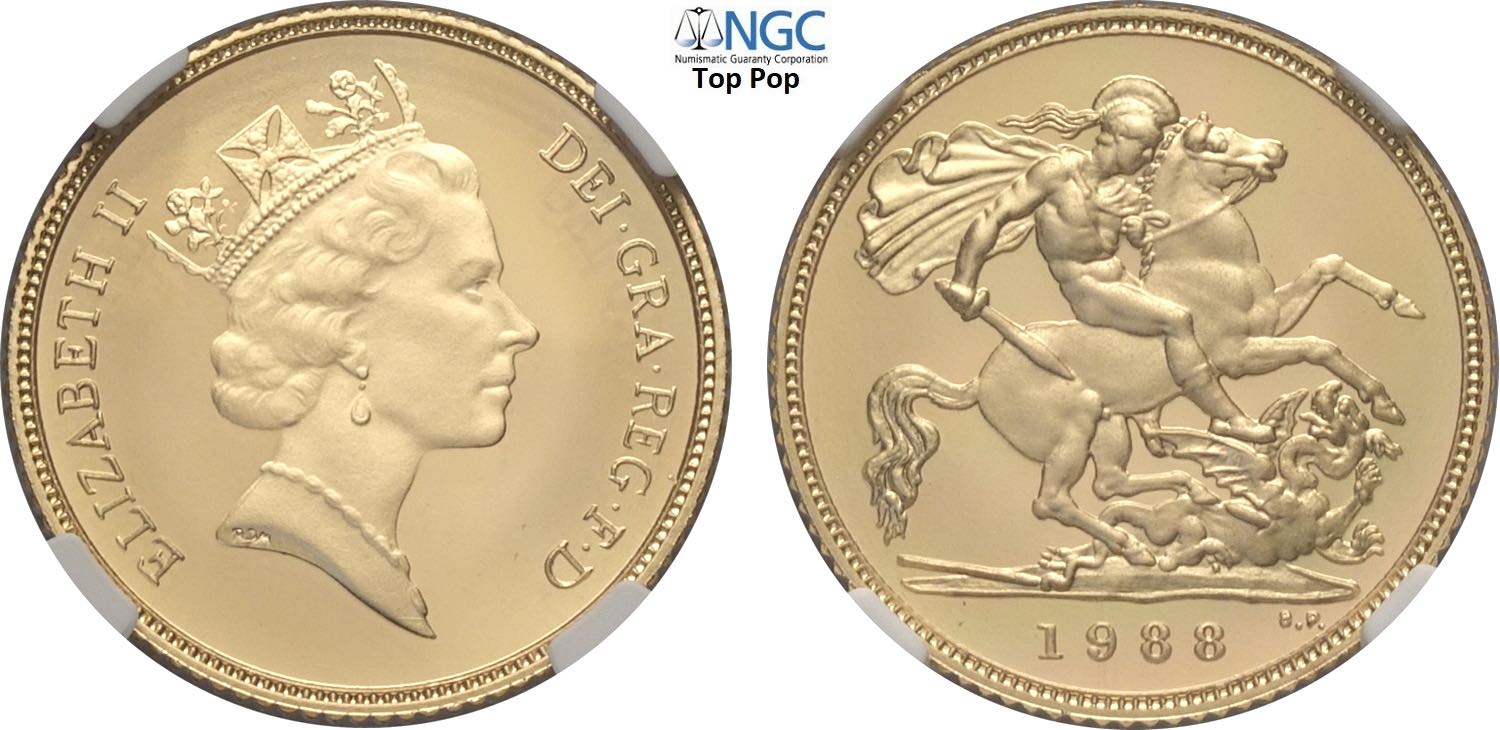 Great Britain, Elizabeth II (1952-2022), Proof Half Sovereign 1988, London Mint, Au 19,3 mm 3,99 g, in Slab NGC PF70 Ultra Cameo Top Pop! ... Read more