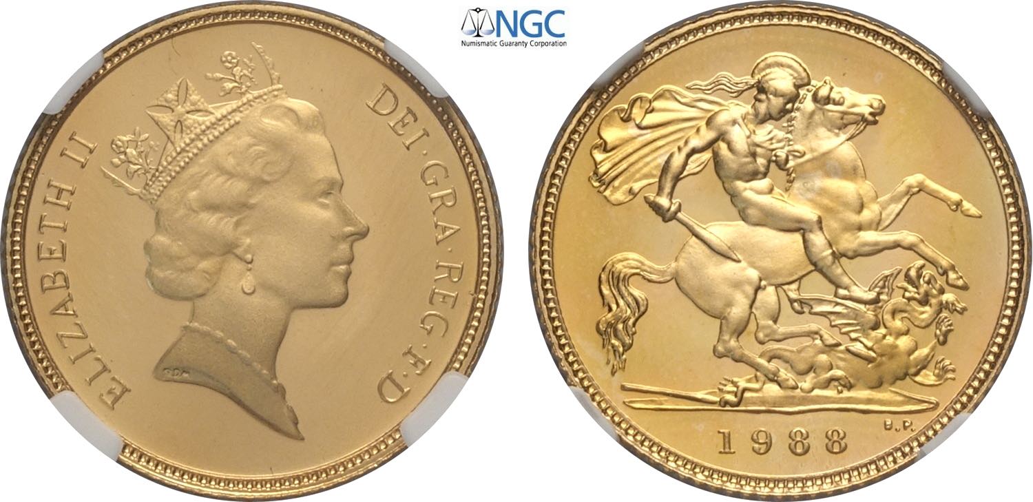 Great Britain, Elizabeth II (1952-2022), Proof Half Sovereign 1988, London Mint, Au 19,3 mm 3,99 g, in Slab NGC PF67 Ultra Cameo