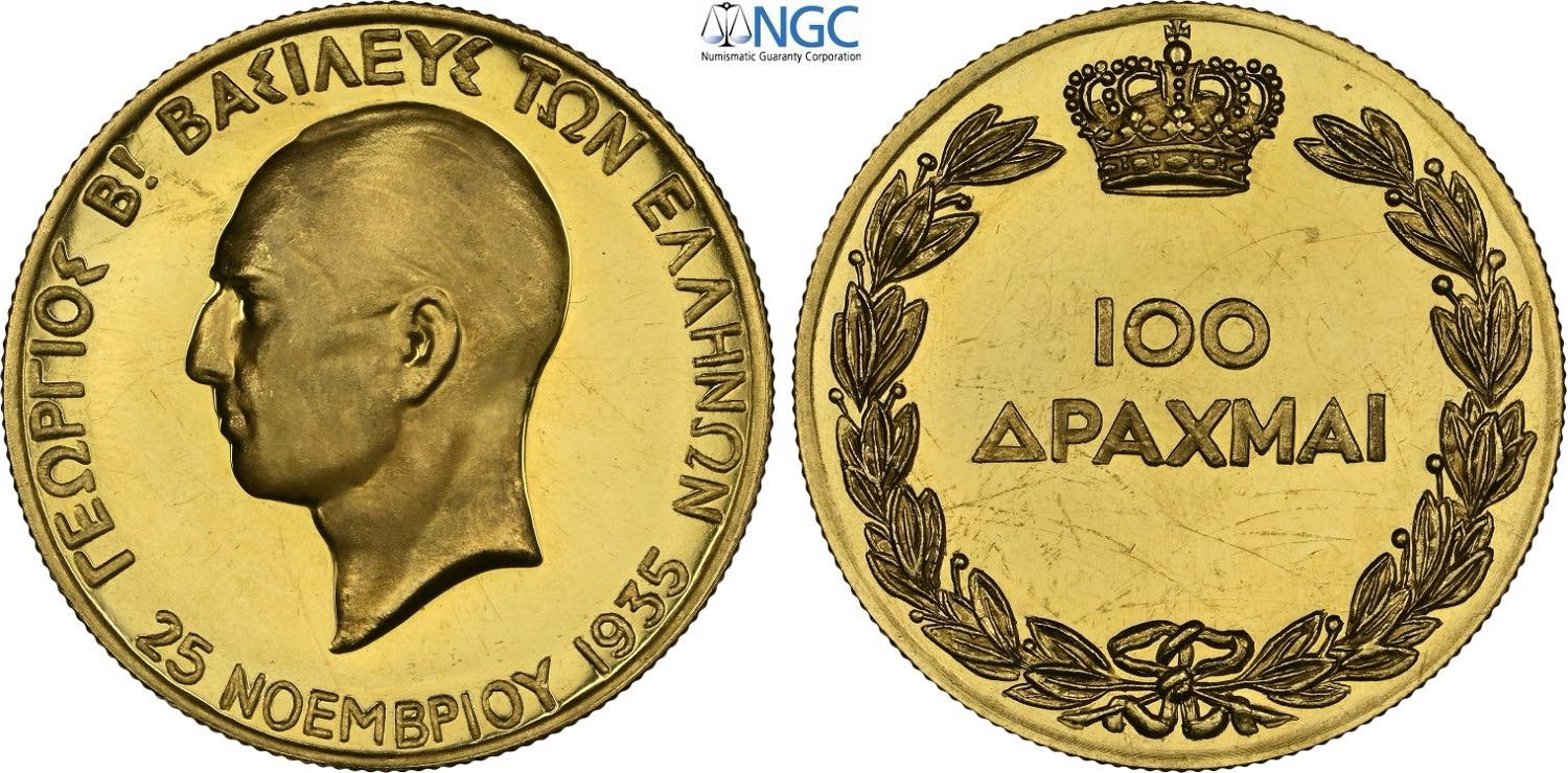Greece, George II (1922-1923 / 1935-1947), 100 Drachmai 1935 (1940), Birmingham mint, mintage: 140, Rare Au 38 mm 32,26 g, di qualità eccezionale con gran contrasto (Ultra Cameo), in Slab NGC PF65 Ultra Cameo (cert. 6494309001 second best grade)
