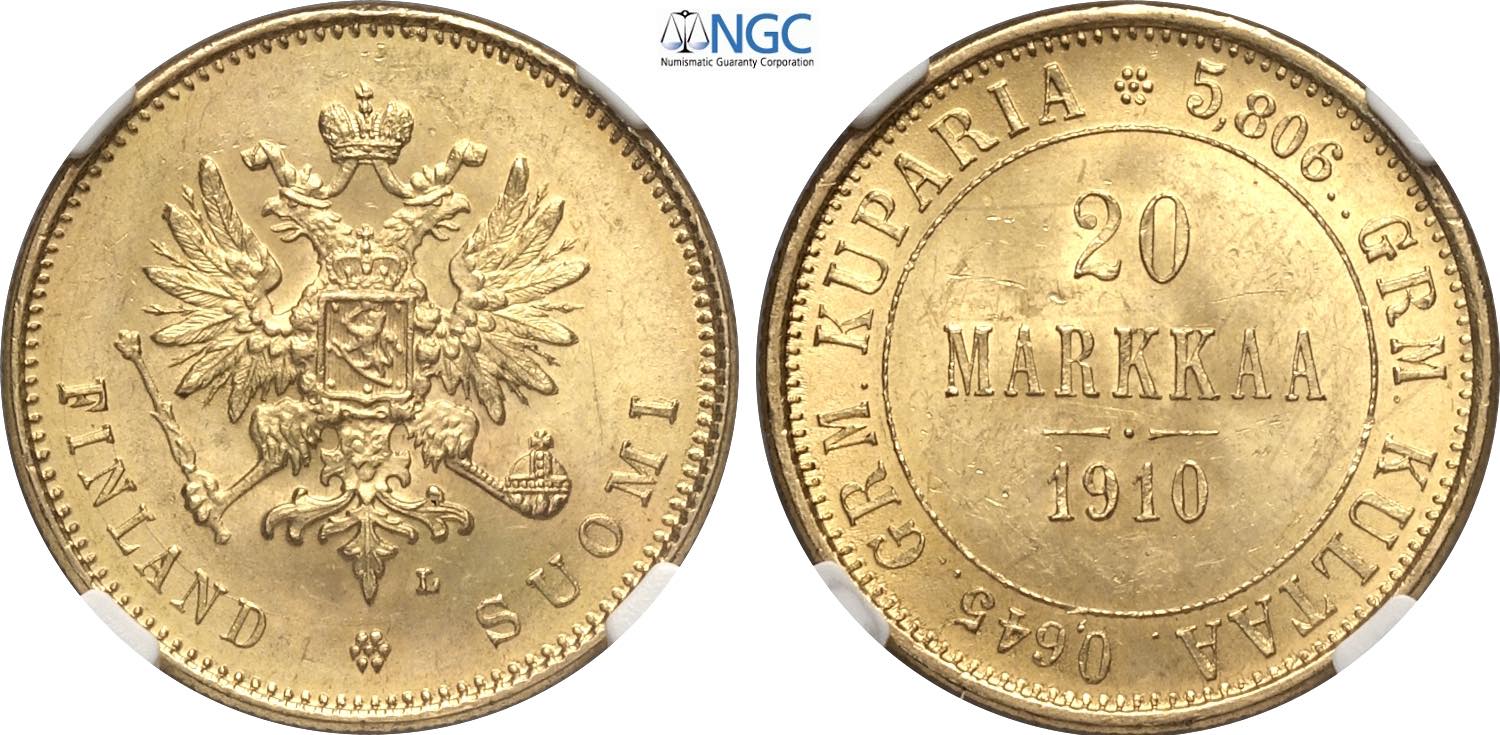 Finland, Nicholas II (1894-1917), 20 Markkaa 1910-L, Helsinki mint, Au 21,3 mm, 6,45 g, in Slab NGC MS63+