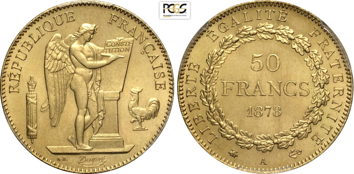 France, Third Republic (1870-1940), 50 Francs 1878-A, Paris mint, Gad-1113, Au 28 mm, 16,13 g, di eccezionale qualità, in Slab PCGS MS66+ (only 1 coin is graded higher)