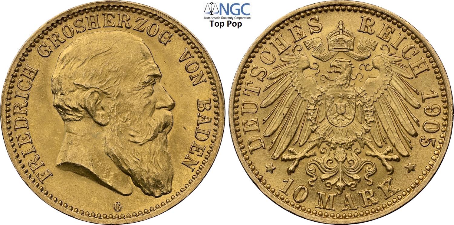Germany Baden, Friedrich I (1852-1907), 10 Mark 1905-G, Stuttgard mint, Au 19,5 mm, 3,98 g, in Slab NGC MS64 Top Pop (cert. 6647822003)