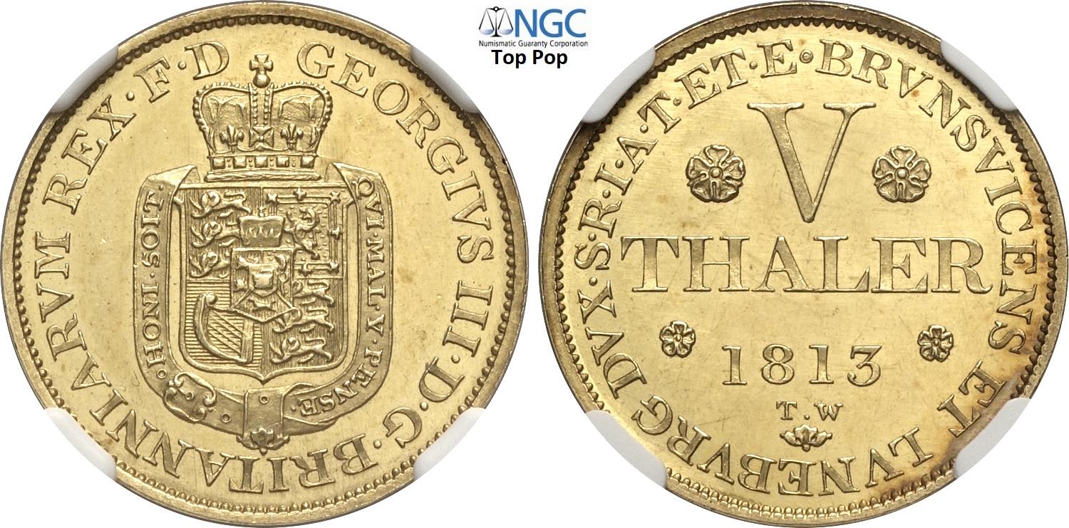 Germany Hannover, George III (1760-1820), Proof 5 Thaler 1813-TW plain edge, London mint, KM-Pn4, Au 23 mm, 6,65 g, in Slab NGC PF63 Cameo Top Pop (cert. 1639780003)