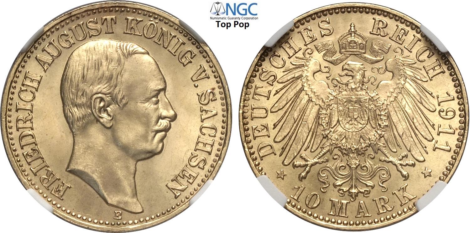 Germany Saxony-Albertine, Friedrich August III (1904-1918), 10 Mark 1911-E, Dresden mint, Au 19,5 mm, 3,98 g, eccezionale, in Slab NGC MS66 Top Pop (cert. 4247647005)