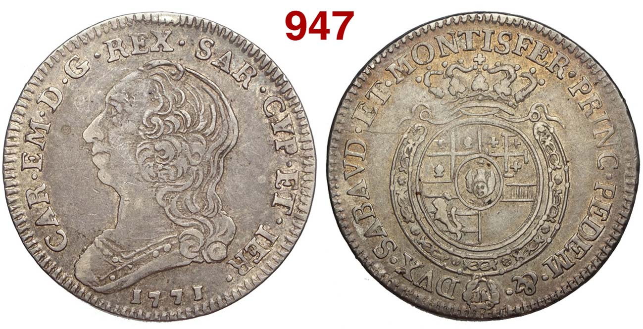Lot 947 - Savoia - Carlo Emanuele III - Quarto di Scudo 1771 - AG g. ...