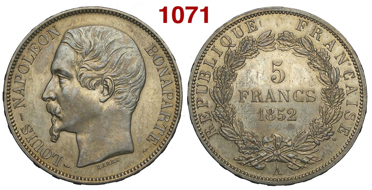 France - Second Republic - 5 Francs 1852 A - AG mm 37 - impercettibile vecchia pulitura, ma ottimo esemplare dal rovescio speculare, SPL