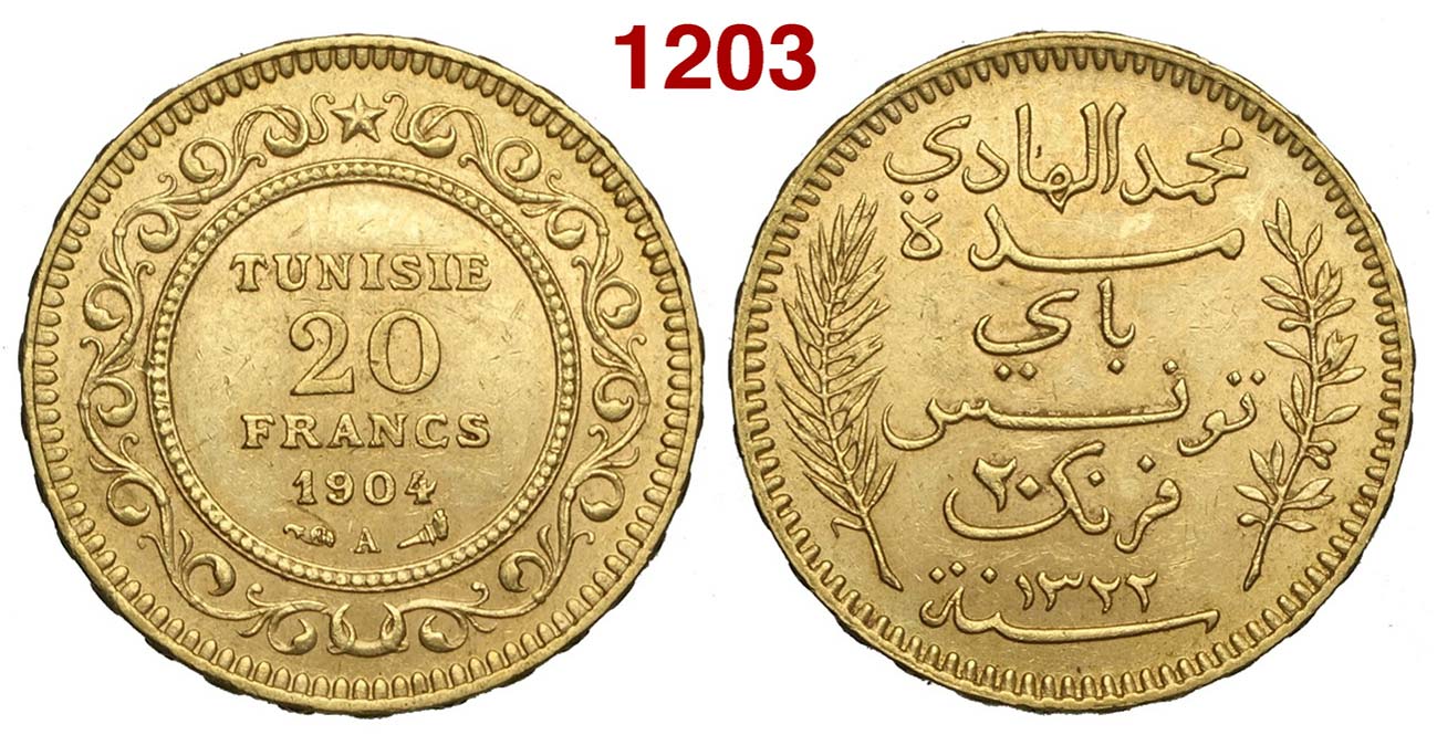 Lot 1203 - Tunisia - Muhammad Al-Hadi Bey - 20 Francs 1904 - AU mm 21 ...