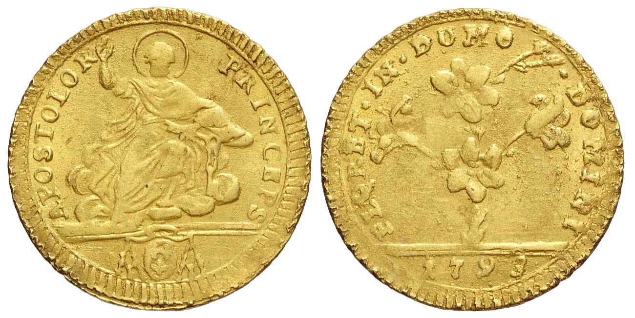 Roma, Pio VI, Doppia 1793, Au mm 23 g 5,47, porosità altrimenti BB