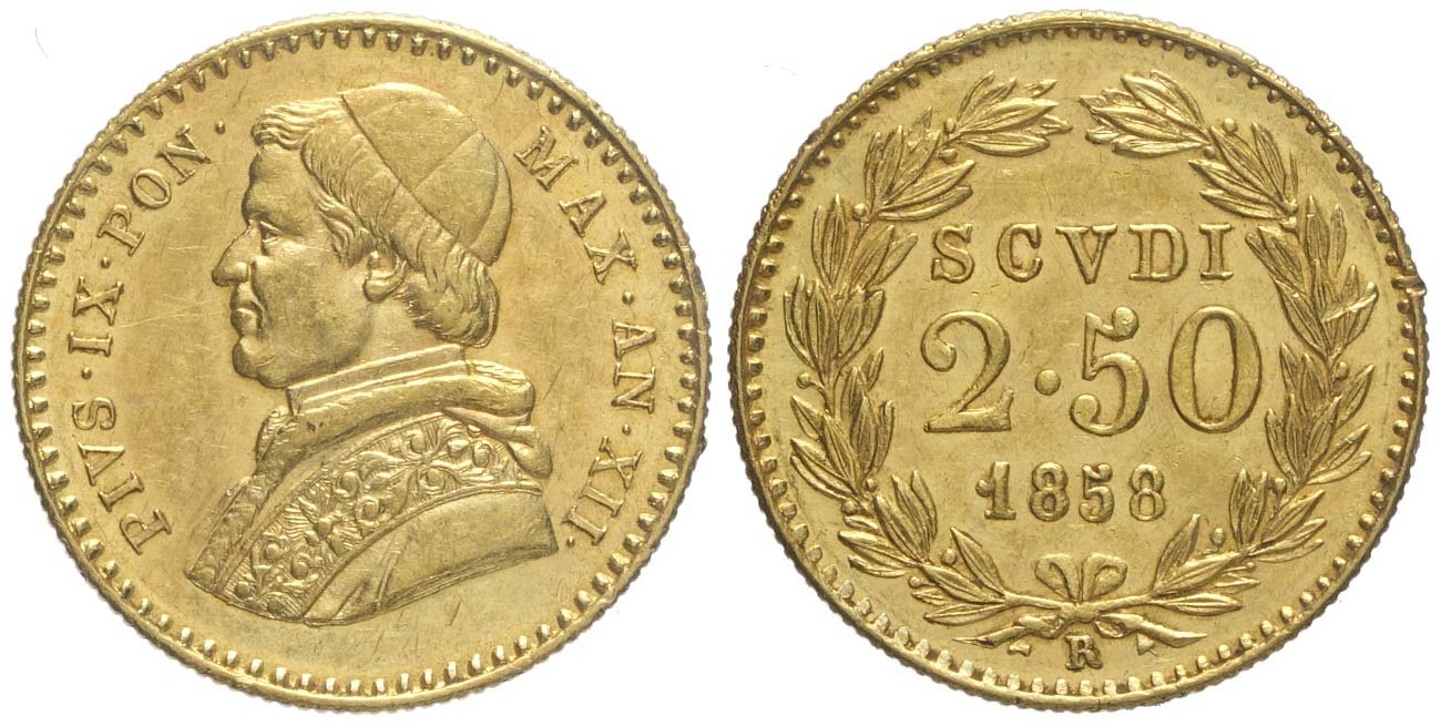 Roma, Pio IX, 2,5 Scudi 1858 anno XII segno "R" piccolo, Au mm 19 g 4,33, BB-SPL