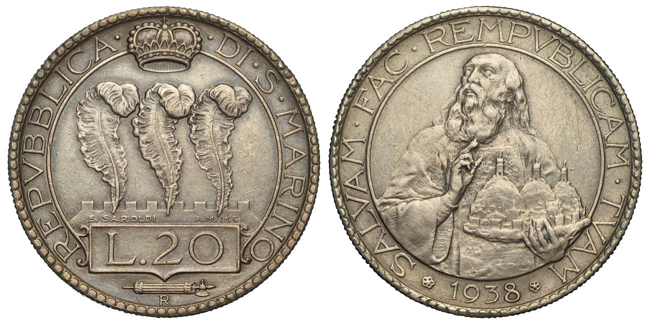 San Marino, Vecchia monetazione, 20 Lire 1938, RR Ag mm 35,5 BB-SPL