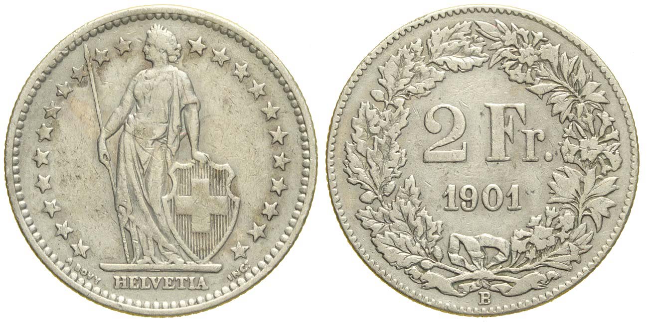 Switzerland, Confederation, 2 Francs 1901, RR Ag mm 27 g 9,83, buon BB