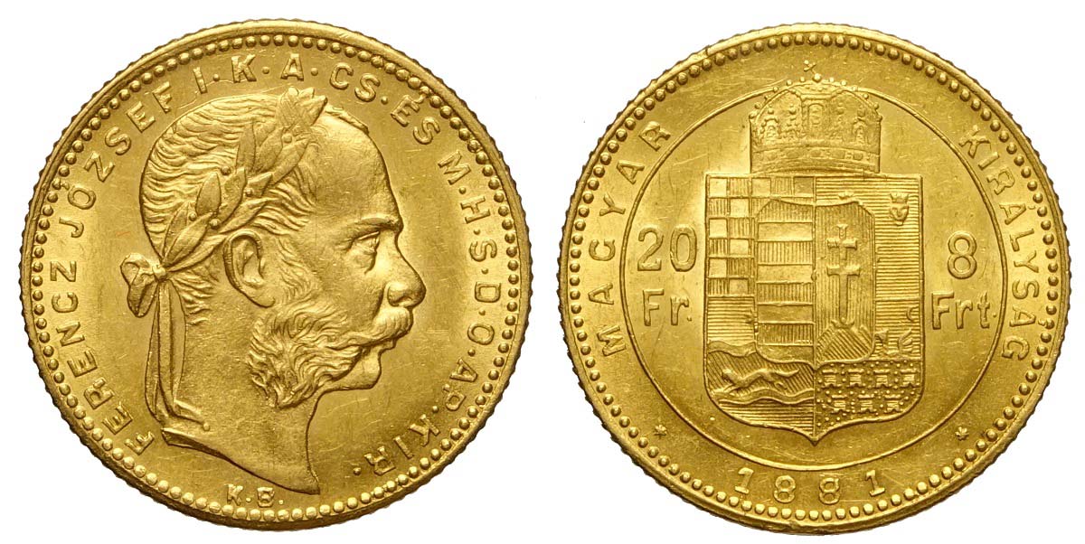 Lot 333 - Hungary, Franz Joseph I, 20 Francs 1881 Au mm 21 SPL-FDC