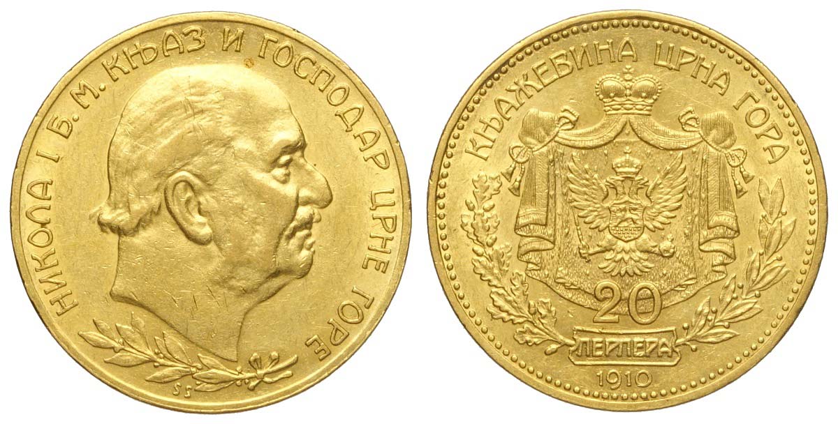 Lot 338 - Montenegro, Nicholas I, 20 Perpera 1910, Au mm 21 SPL