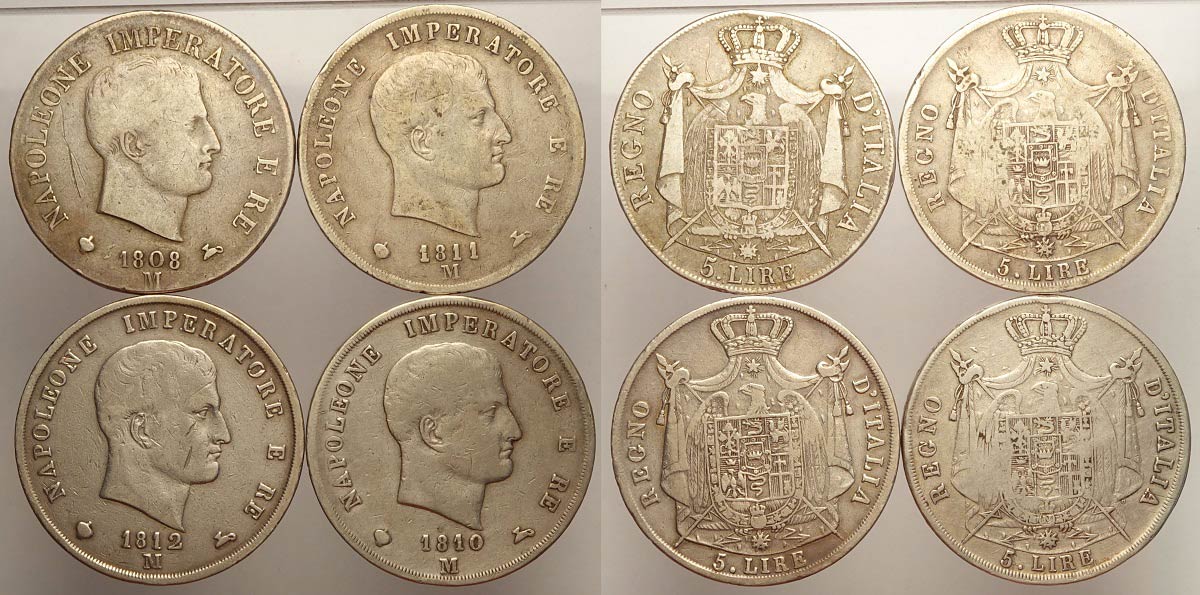 Napoleone I Re d'Italia, lotto di 4 monete da 5 Lire Ag: 1808-M; 1810-M RR; 1811-M; 1812-M