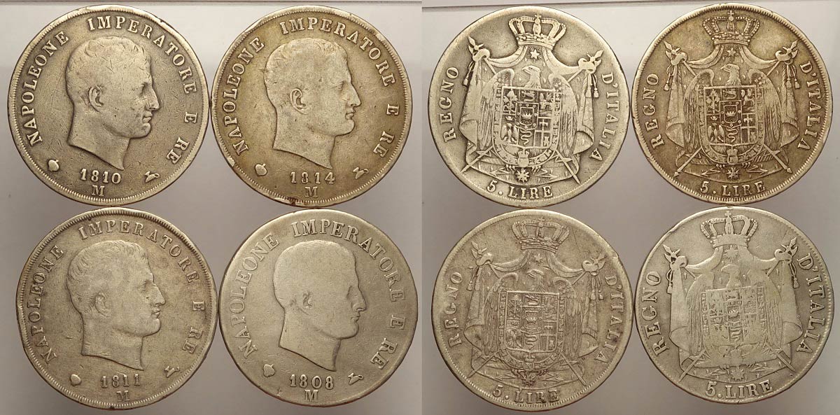 Napoleone I Re d'Italia, lotto di 4 monete da 5 Lire Ag: 1808-M; 1810-M RR; 1811-M; 1814-M