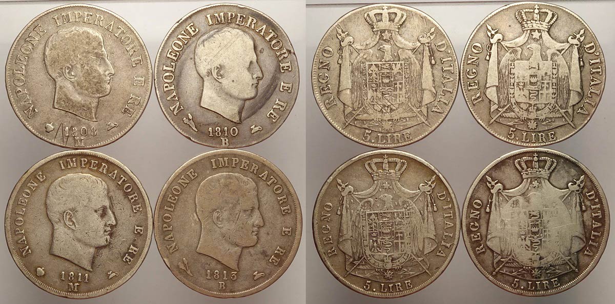 Napoleone I Re d'Italia, lotto di 4 monete da 5 Lire Ag: 1808-M; 1810-B Rara; 1811-M; 1813-B RR