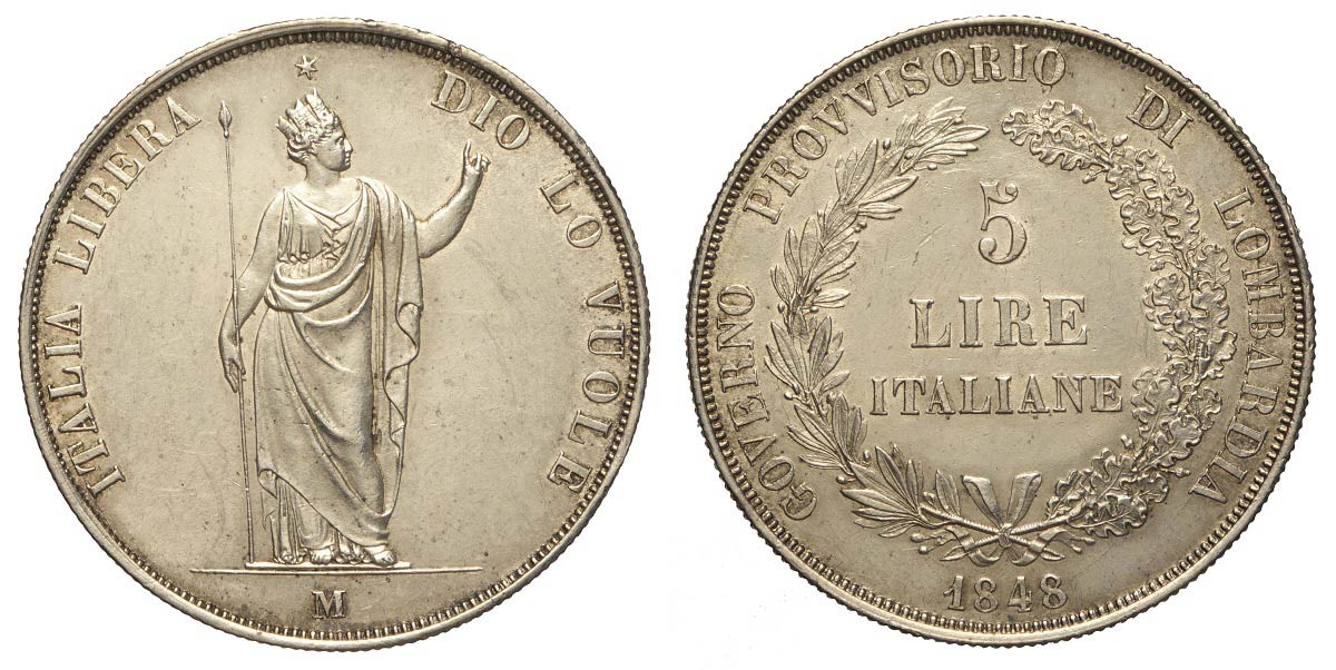 Milano, Governo Provvisorio, 5 Lire 1848, Pag 213 Ag mm 37 leggermente pulita altrimenti SPL-FDC