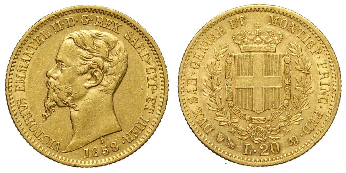 Savoia, Vittorio Emanuele II Re di Sardegna, 20 Lire 1858 Genova, Au mm 21 q.SPL