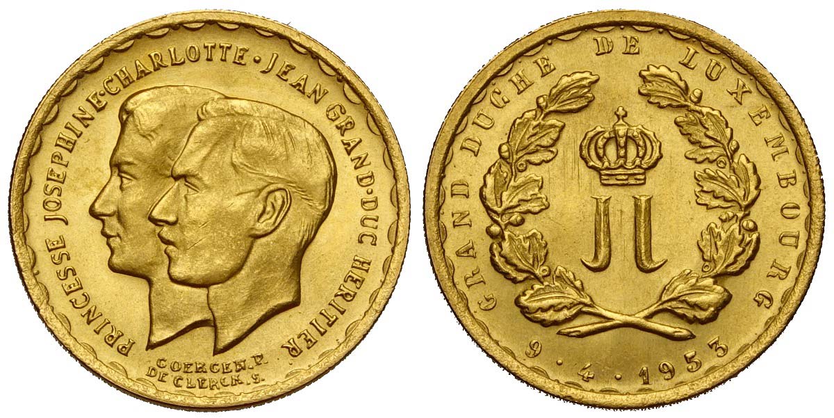 Lot 439 - Luxembourg, Charlotte, 20 Francs 1953, Au mm 21 g 6,45 q.FDC
