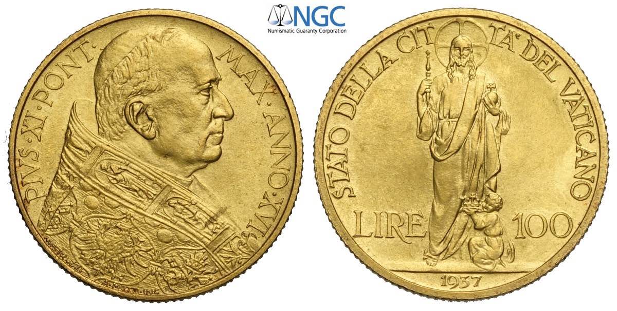 Roma, Pio XI, 100 Lire 1937 anno XVI, RRR Au mm 20,7 FDC, in Slab NGC MS64