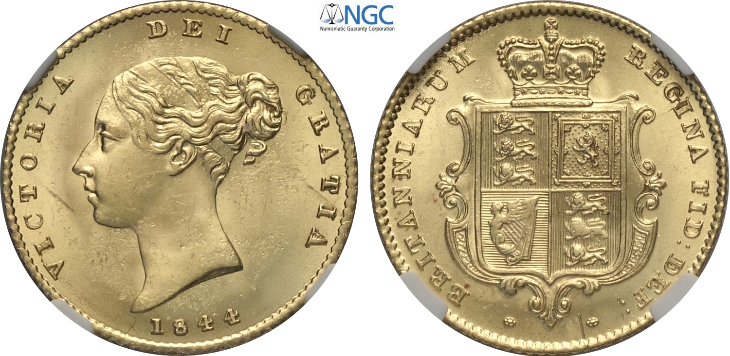Great Britain, Victoria (1837-1901), 1/2 Sovereign 1844, London mint, Au 19 mm, 3,99 g, in Slab NGC MS64 (only 1 coin is graded ...