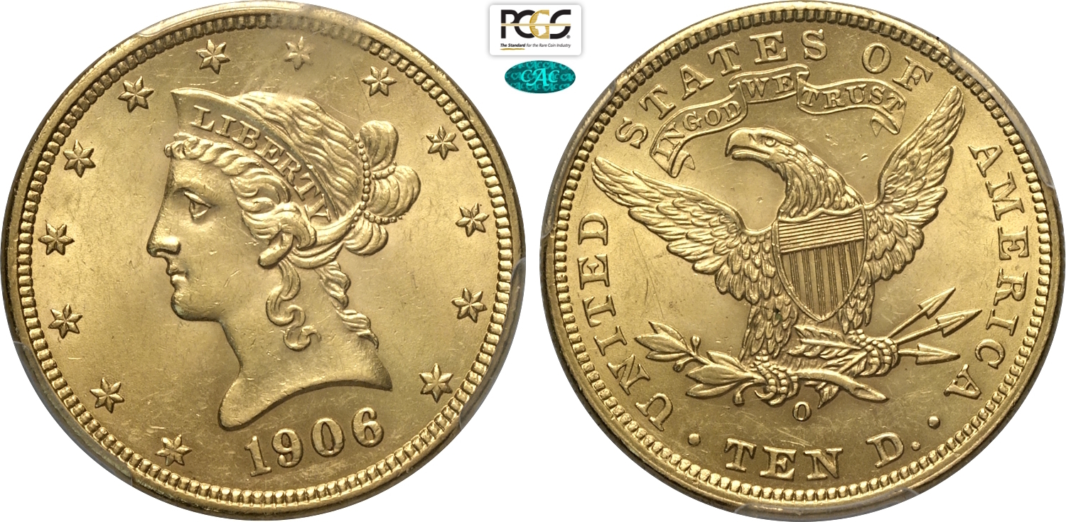 United States of America, Federal Republic (1776-), Coronet Head eagles, 10 Dollars 1906-O, New Orleans mint, Au 27 mm, 16,72 g, in Slab PCGS/CAC MS64