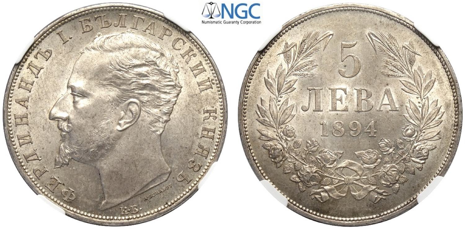 Bulgaria, Ferdinand I (1887-1918), 5 Leva 1894, Ag mm 37 di gran qualità, in Slab NGC MS63 (second best grade, cert. 6631820018)