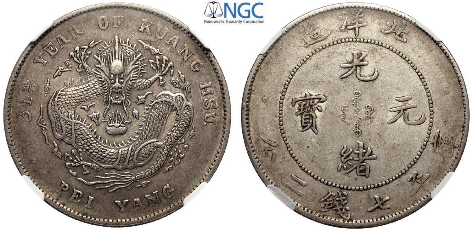 China Chihli, Kuang-Hsu (1875-1908), Dollar Year 34 (1908) Short Tail variety, L&M-465A Ag mm 39 in Slab NGC AU53 (cert. 5790657005)