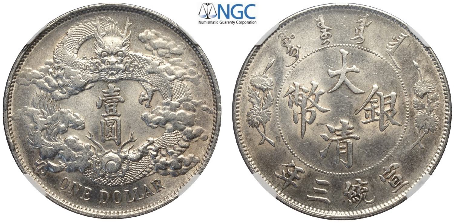 China, Hsuan-t'ung (1908-1911), Dollar Year 3 (1911) no period, extra flame variety. L&M-37 Ag mm 39 in Slab NGC MS62 (cert. 5786590019)
