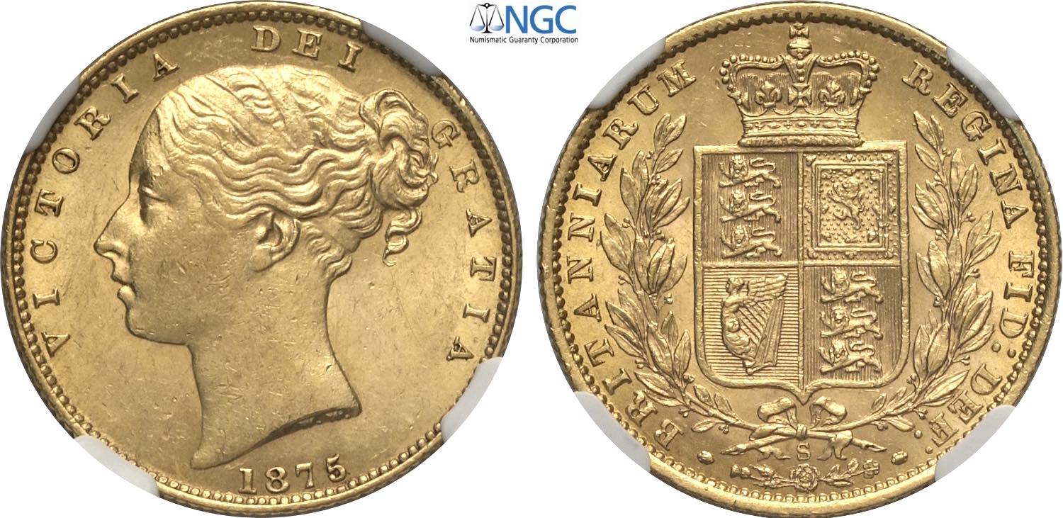 Australia, Victoria (1837-1901), Shield Sovereign 1875-S, Sydney mint, Au 22 mm, 7,99 g, in Slab NGC MS62