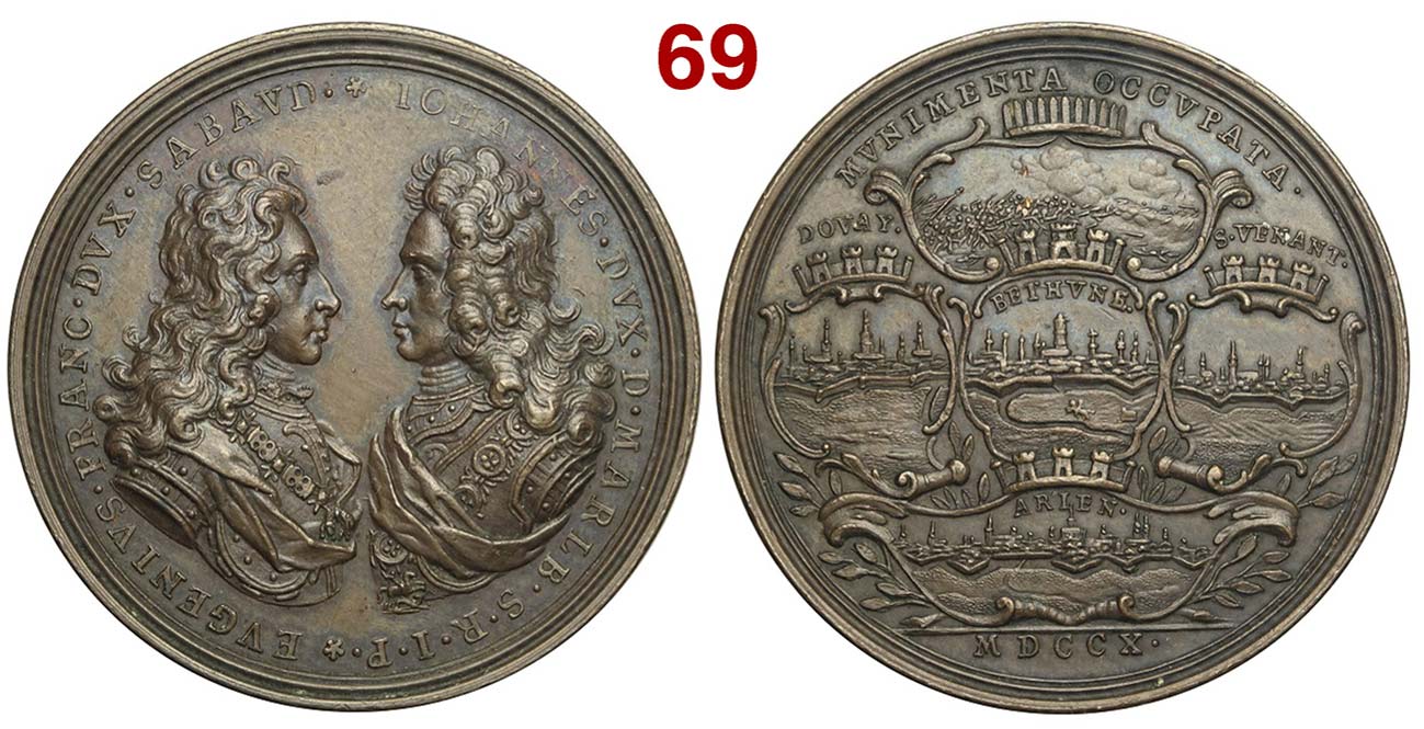Eugenio di Savoia e Giovanni di Marlborough - Medaglia a ricordo dell'occupazione delle roccaforti 1710, Br, 44mm, 32g, R, q.FDC