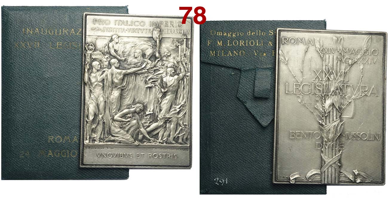 Placca a ricordo della XXVII Legislatura 1924 completa di confezione originale, opus E. Boninsegna, Ag, 51x70mm, 85g, RR, FDC