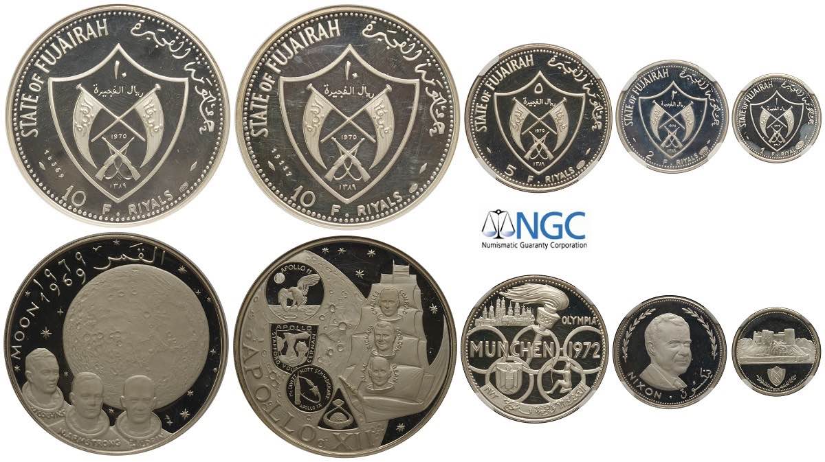 Fujairah, United Arab Emirates, Silver Proof Set 1970 (5), Ag mm 45, 45, 30, 24, 13 in Slab NGC: 10 Riyals KM-5 PF63, 10 Riyals KM-4.1 ...