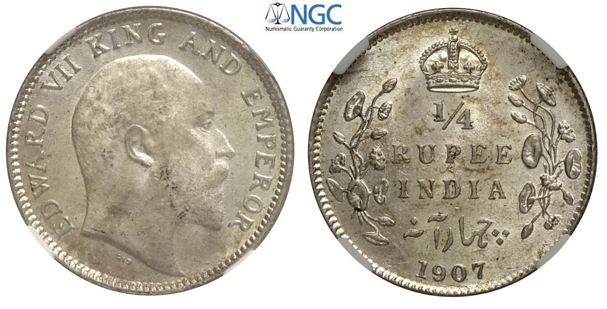 India-British, Edward VII, 1/4 Rupee 1907 (c) Calcutta, Ag mm 20 in Slab NGC MS63