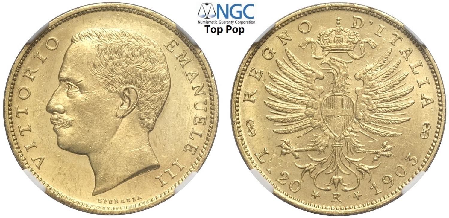 Regno d'Italia, Vittorio Emanuele III (1900-1943), 20 Lire 1905, Rara Au mm 21 in Slab NGC MS62 (cert. 5789044014)