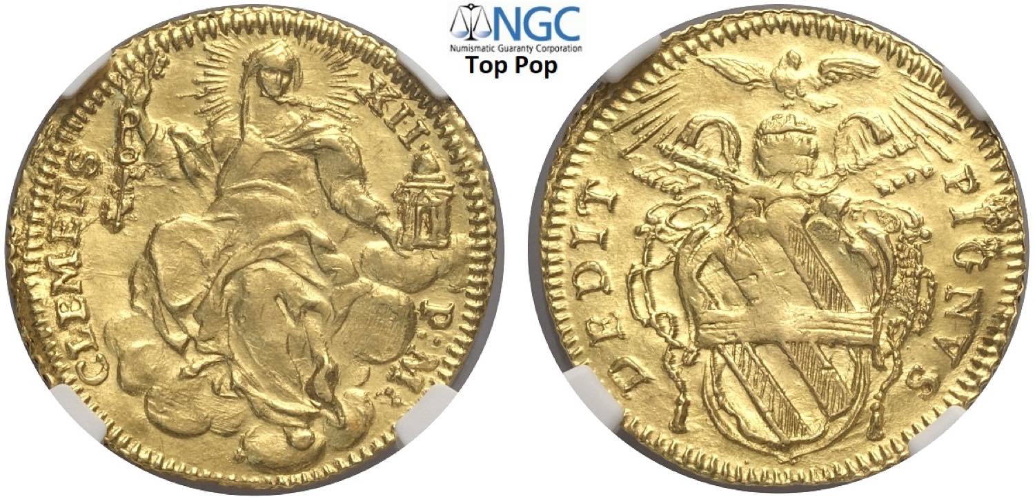 Roma, Clemente XII (1730-1740), Zecchino s.d., Rara Munt-5 Au mm 21 di alta conservazione, in Slab NGC MS64 (Top Pop! cert. 5786602020)
