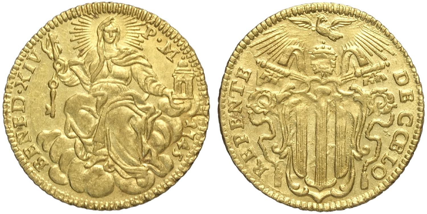 Roma, Benedetto XIV (1740-1758), Zecchino 1756 anno XVII, RR Munt-19i Fr-231 Au mm 22 di ottima conservazione, in Slab NGC MS63 (second ...