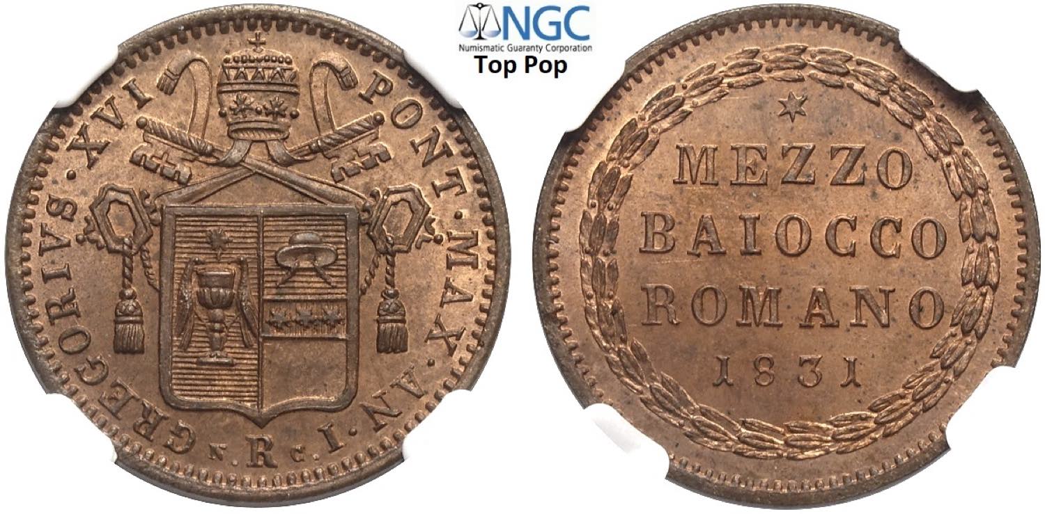 Roma, Gregorio XVI (1831-1846), Mezzo Baiocco 1831 anno I, Cu mm 23,5 conservazione eccezionale in rame rosso, in Slab NGC MS66 RB (Top ...