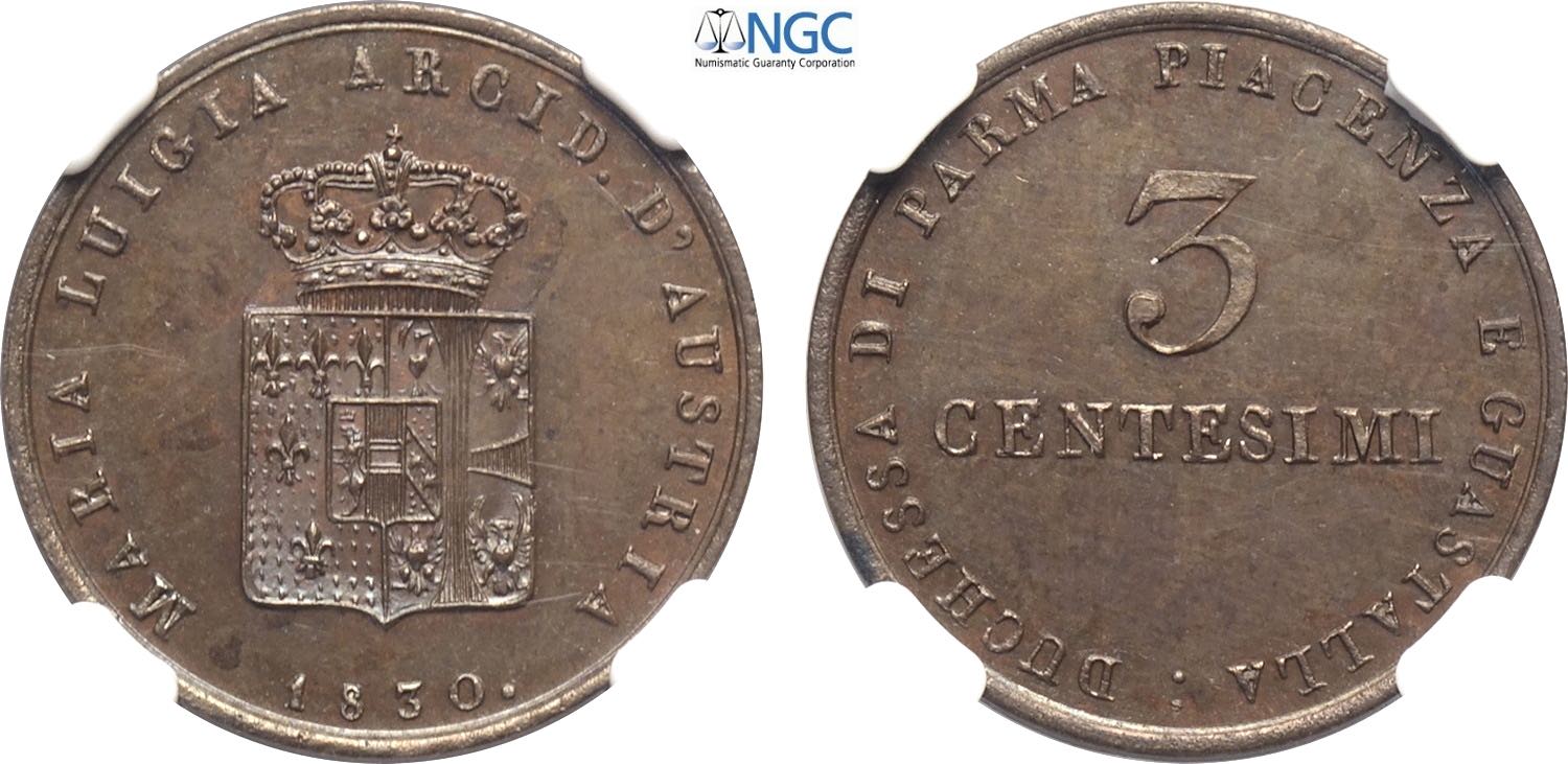 Parma, Maria Luigia d'Austria (1815-1847), 3 Centesimi 1830, RR Cu 23 mm, in Slab NGC MS63 BN