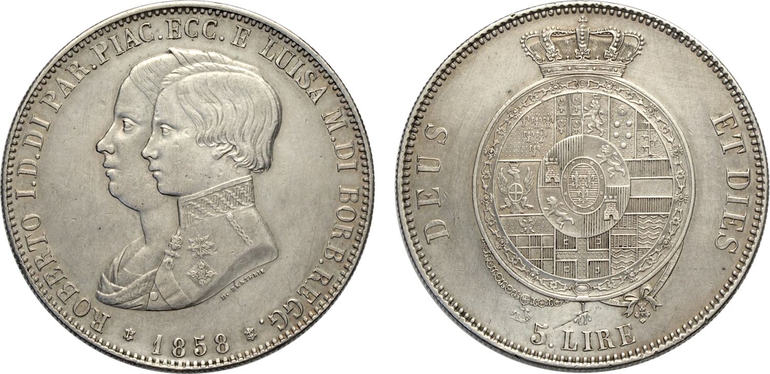 Parma, Roberto I di Borbone (1854-1859), 5 Lire 1858, Rara Gig-1 Ag 37,5 mm, lievi tracce di pulitura altrimenti SPL