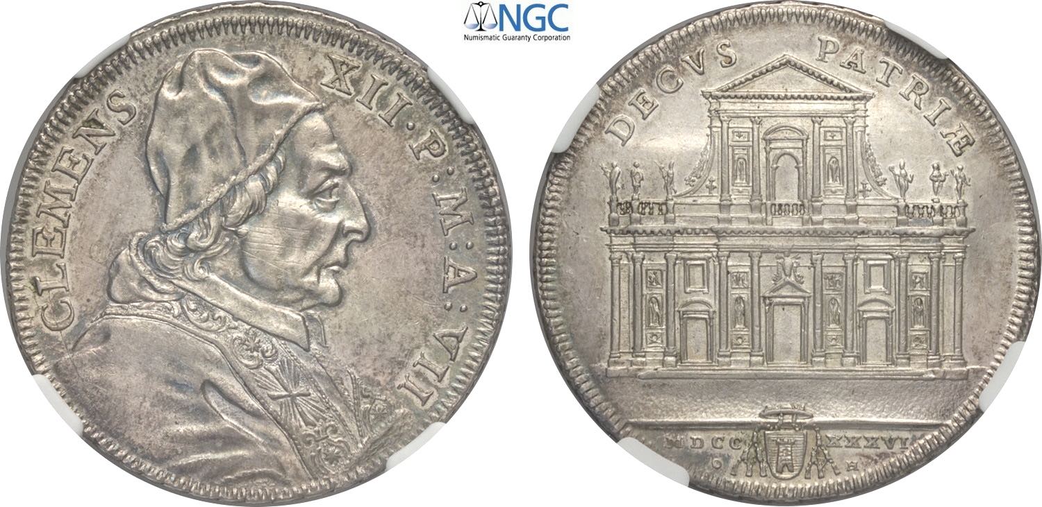 Roma, Clemente XII (1730-1740), Mezza Piastra 1736-VII, Rara Munt-19 Ag 36 mm, in Slab NGC AU58