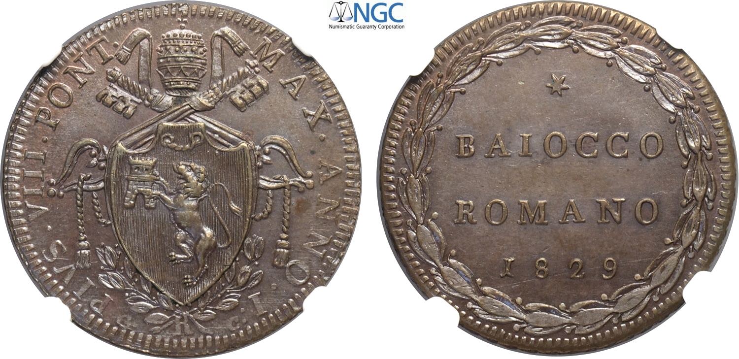 Roma, Pio VIII (1829-1830), 1/2 Baiocco 1829-I, Rara Gig-5 Cu 26 mm 5,93 g, eccezionale, in Slab NGC MS65 BN Top Pop! (cert. 6638738014)