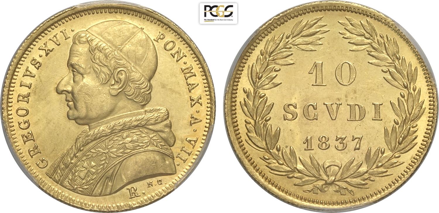 Roma, Gregorio XVI (1831-1846), 10 Scudi 1837-VII, Rara Au 28 mm, in Slab PCGS MS63