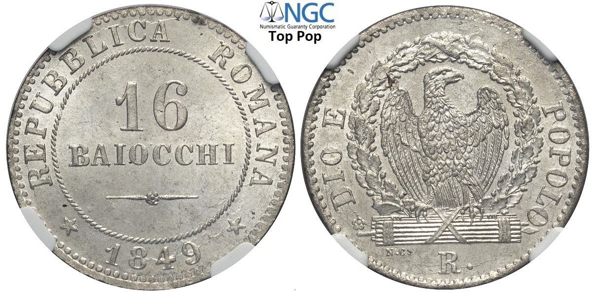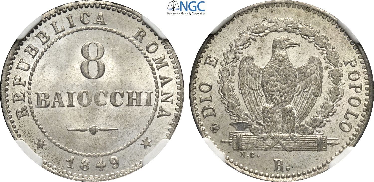 Roma, Repubblica Romana (1848-1849), 8 Baiocchi 1849-R, Roma, Mi 23 mm 3,90 g, eccezionale, in Slab NGC MS65