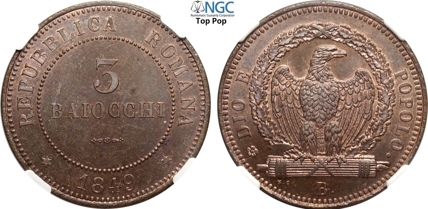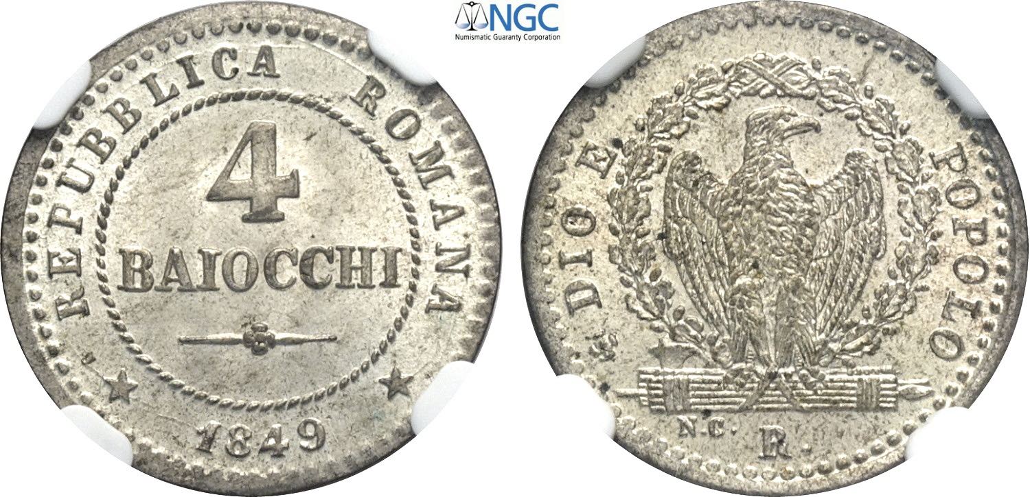 Roma, Repubblica Romana (1848-1849), 4 Baiocchi 1849-R, Roma, Mi 18 mm 1,95 g, eccezionale, in Slab NGC MS65